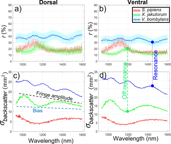 This study explores how insect wing interference, which is highly sensitive to membrane thickness, can be used to differentiate species both in the lab and in the wild. While previous research has noted the diversity of wing interference patterns, this report is the first to link resonant coherent scattering from membranes to the goniometric scattering phase function. By combining spectral and goniometric analysis, the researchers demonstrate that resonant wavelengths interact specifically with thin, flat wing membranes, while dissonant wavelengths primarily scatter from tubular veins. This work establishes a foundation for better understanding range dependence in entomological Lidar and improving insect identification through spectral and modulation properties.